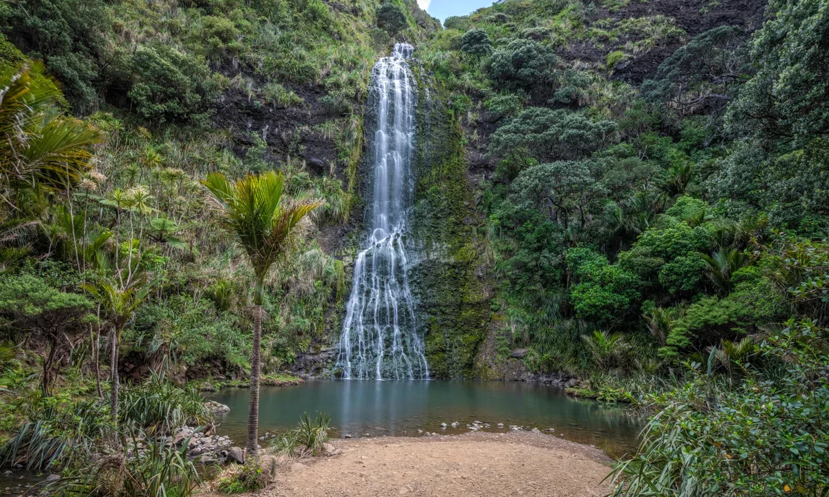 A 55-metre waterfall dropping into a pool below, framed by forest. One of NZ’s most romantic waterfalls. The tall cascade looks like a silver ribbon against green cliffs.