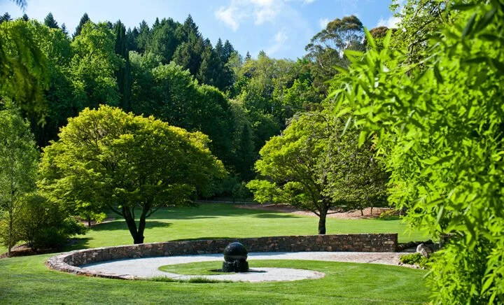 One of New Zealand’s finest private gardens with terraces, sculptures, and views over Lyttelton Harbour. A romantic, fairytale-like setting. The harbor views shimmer in the distance, adding depth and romance to the gardens.