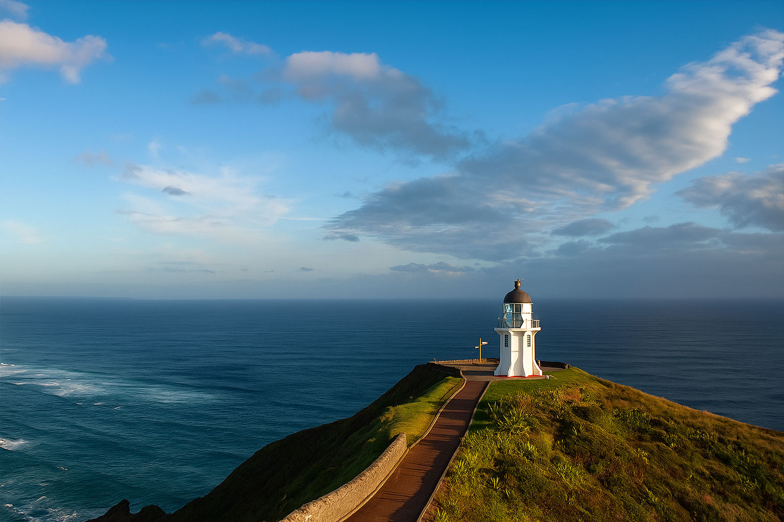 A windswept peninsula with a historic lighthouse and dramatic coastal views. The endless seascape glows under golden evening light.