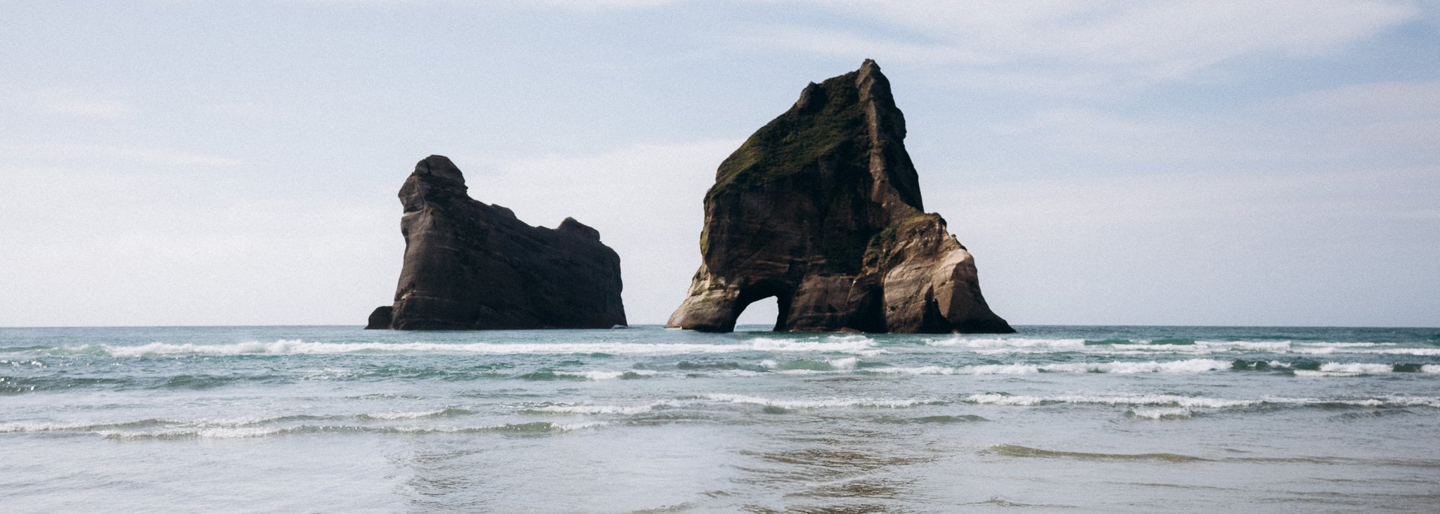 A dramatic west coast beach with black sand and the iconic Lion Rock. Bold, raw, and unforgettable. Crashing waves meet rugged cliffs under fiery sunsets.